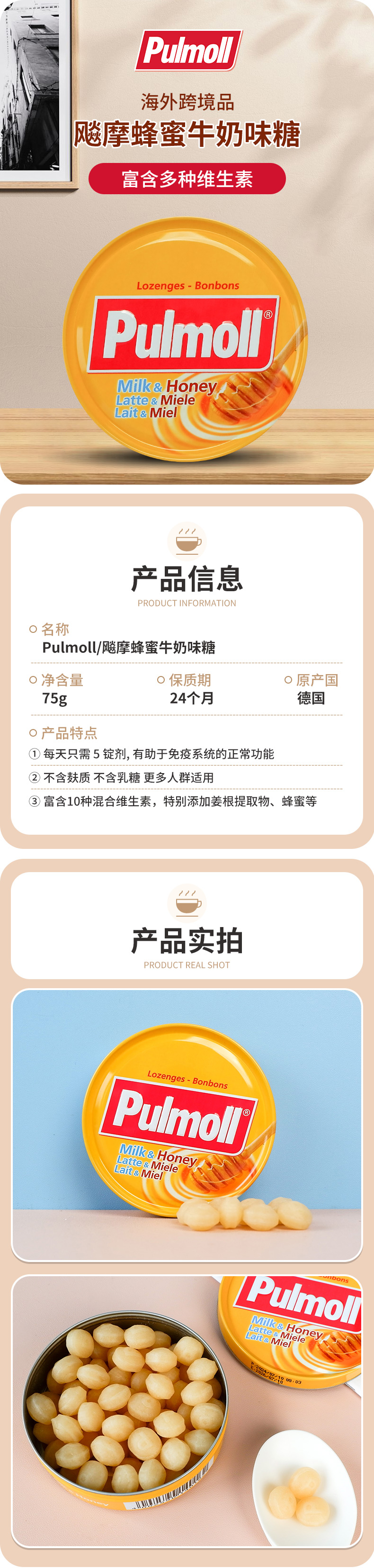 Pulmoll飚摩蜂蜜牛奶味糖75g